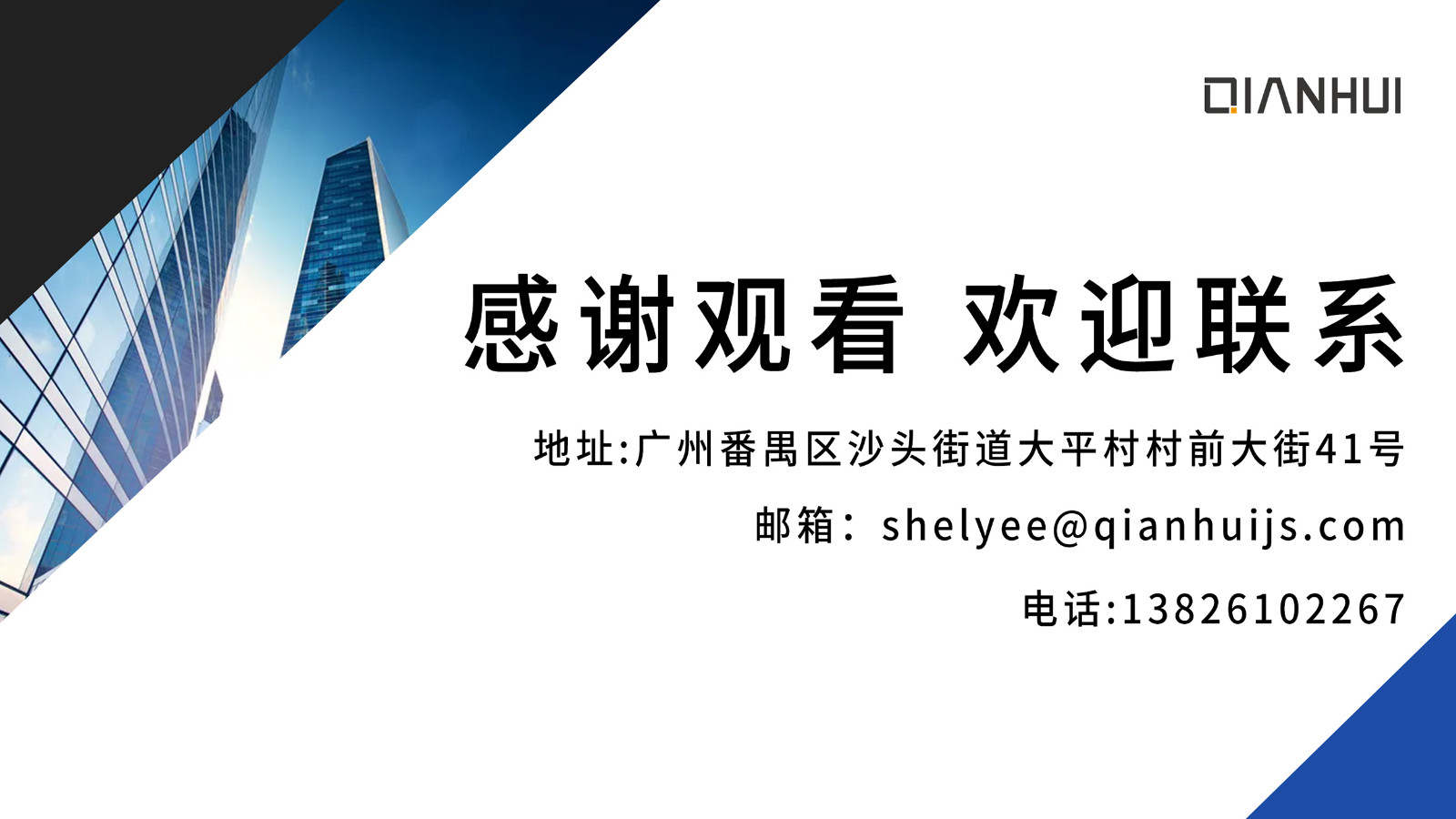 廣州千惠智能科技有限公司 Guangzhou Qianhui Intelligent Technology Co., Ltd. 地址 Address:廣州市番禺區(qū)沙頭街大平村村大街41號102號 No. 41, Cunqian Street, Daping village , Shatou Jiedao, Panyu District,511400, GuangZhou, China 郵件/Email ;sales@qianhuijs.com 聯(lián)系電話 Contact ;138 2610 2267 香港公司:香港千惠有限公司 HK QIANHUI LIMITED 地址 Address:九龍尖沙咀科學館道14號新文華中心A座9樓917A室 UNIT 917A, 9/F., TOWER A, NEW MANDARIN PLAZA, NO.14 SCIENCE MUSEUM ROAD, TSIMSHATSUI, KOWLOON. 郵件Email: shelyee@qianhuijs.com 電話Contact :00852-3460 5868傳真:傳真:00852-3460 5808
